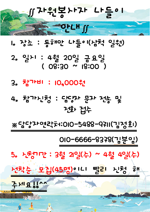 『 2018년 자원봉사자 나들이 』 를 진행 할 계획이오니, 신청기간 꼭 확인하셔서 많은 참여 부탁드립니다.~ ☆