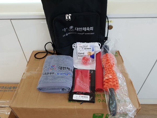 대한체육회에서 100세 시대를 대비하여 홀로 사는 어르신들에게 생활체육에 대한 사회적 관심 제고 및 노인 생활체육을 활성화하기 위해 운동용품을 지원해주셨습니다. 운동꾸러미(악력볼, 마사지스틱, 세라밴드, 탄력바, 스포츠 타올)