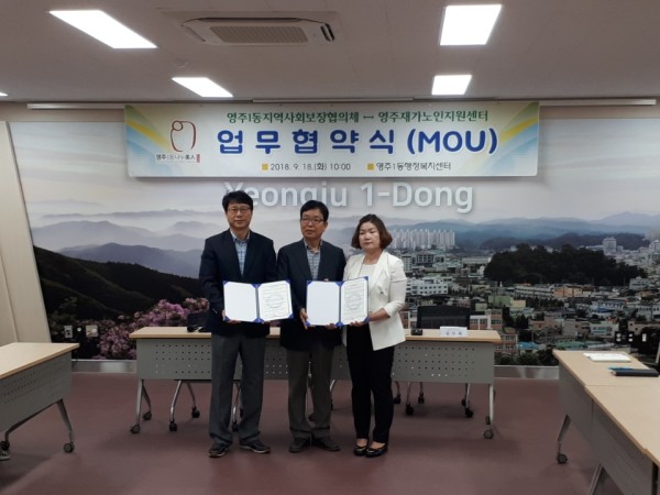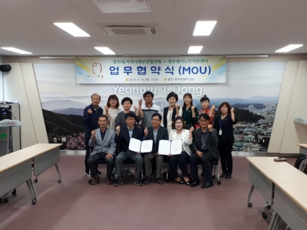2018년 9월 18일(화) 영주1동지역사회보장협의체와 업무협약식을 진행하였습니다. 민과관이 함께 상생하고 정보 교류를 통해 복지사각지대 대상자 발굴 및 독거어르신의 삶의 질 향상을 위해 더욱 노력하겠습니다.