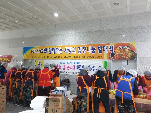 오늘 11월 12일(화) KT&G 영주공장 체육관에서 KT&G 및 본 센터와 영주관내 사회복지기관, 봉사단체들이 모여 사랑의 김장 나눔 행사를 진행하였습니다. (절인배추를 나르기부터 양념 버무리기까지 완전 공장 같았다는 행사참여한 홍보담당의 후문입니다:D) 오늘 만들어진 김장김치는 각 기관에 배부되었으며, 본 센터는 어르신들께 잘 전달해드릴 예정입니다. 오늘 함께해주신 KT&G영주공장과 각 기관 직원 및 봉사자분들께 감사드립니다!