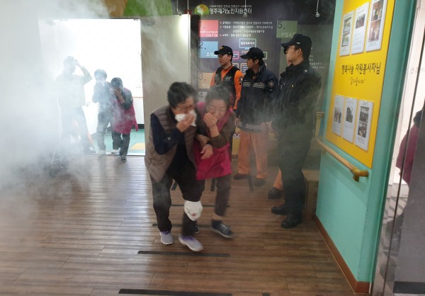 오늘 11월 26일(화) 본 센터에서는 1시 50분부터 가흥119안전센터와 함께 소방대피훈련과 심폐소생술 교육을 실시하였습니다. 실제 상황같이 임하여 직원들은 제 위치에서 역할을 하였고 직접 소화기를 사용하여 불 끄는 연습을 했습니다. 또 주간보호 어르신들도 무릎에 손수건을 둘러 부상자 분장까지 하시며 대피훈련에 임해주셨습니다. (우리 어르신들 귀엽지 않나요 :D) 이후 2층에서 주간보호어르신들과 직원 전체가 함께 소화기 사용법과 심폐소생술 교육을 들으며 안전의식을 높이는 시간이 되었습니다. 언제나 센터의 안전을 위해, 어르신의 안전을 위해 노력하는 영주재가가 되도록 하겠습니다!