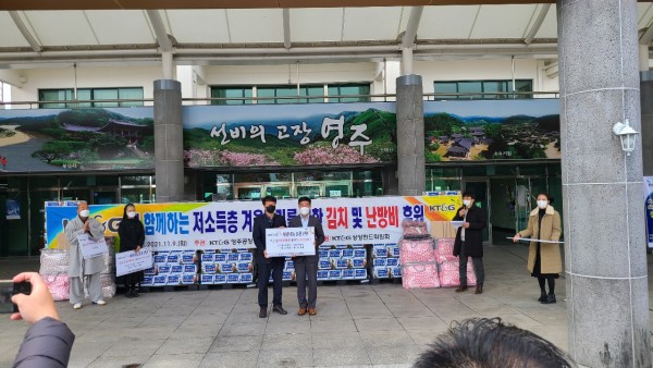 KT&G영주공장 연계사업으로 김장 및 등유,연탄,이불 등의 난방물품, 나눔행사를 진행하였습니다. 지역사회 독거노인 및 경제적으로 어려운 이웃들에게 심리적안정과 정서적 지원, 지역사회 따뜻한 온정을 전하고 든든한 겨울을 보낼 수 있도록 응원하였습니다.~^^