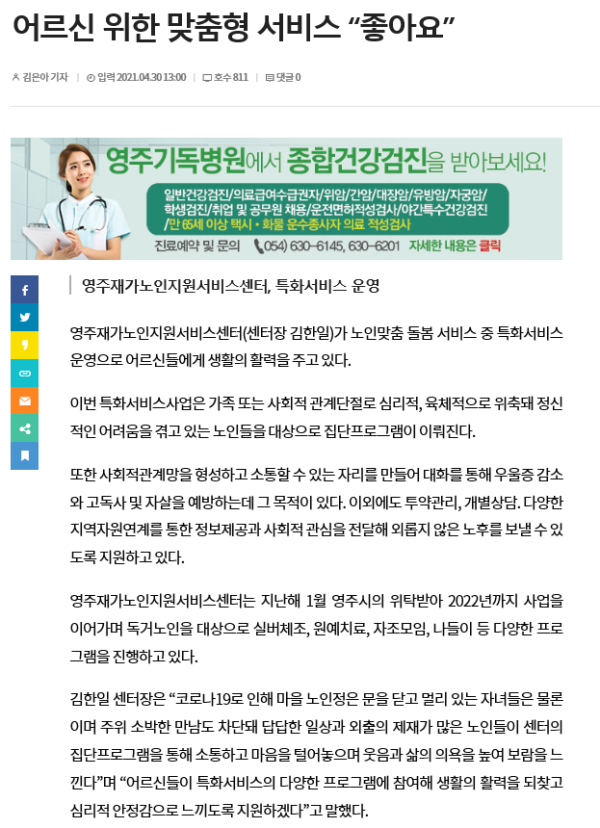 [영주시민신문] 맞춤돌봄 '특화서비스' 보도